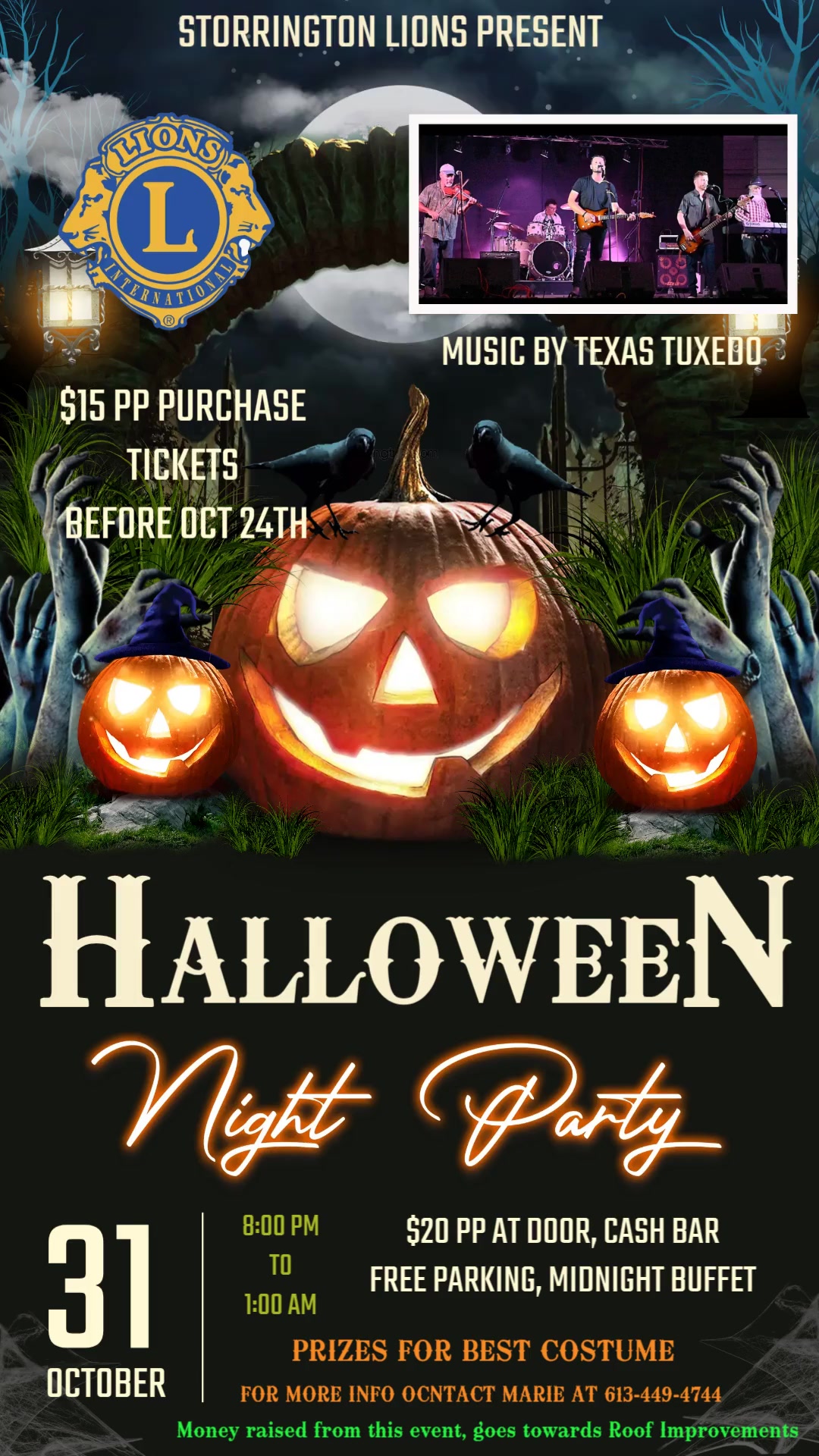 Storrington Lions Club invite you to join them in a Halloween Party from 8p-1a on October 31 at Storrington Lions Hall. $15 pp for tickets before October 24th, $20 pp after Oct 24th. Prizes to be won. Cash bar, free parking, buffet.