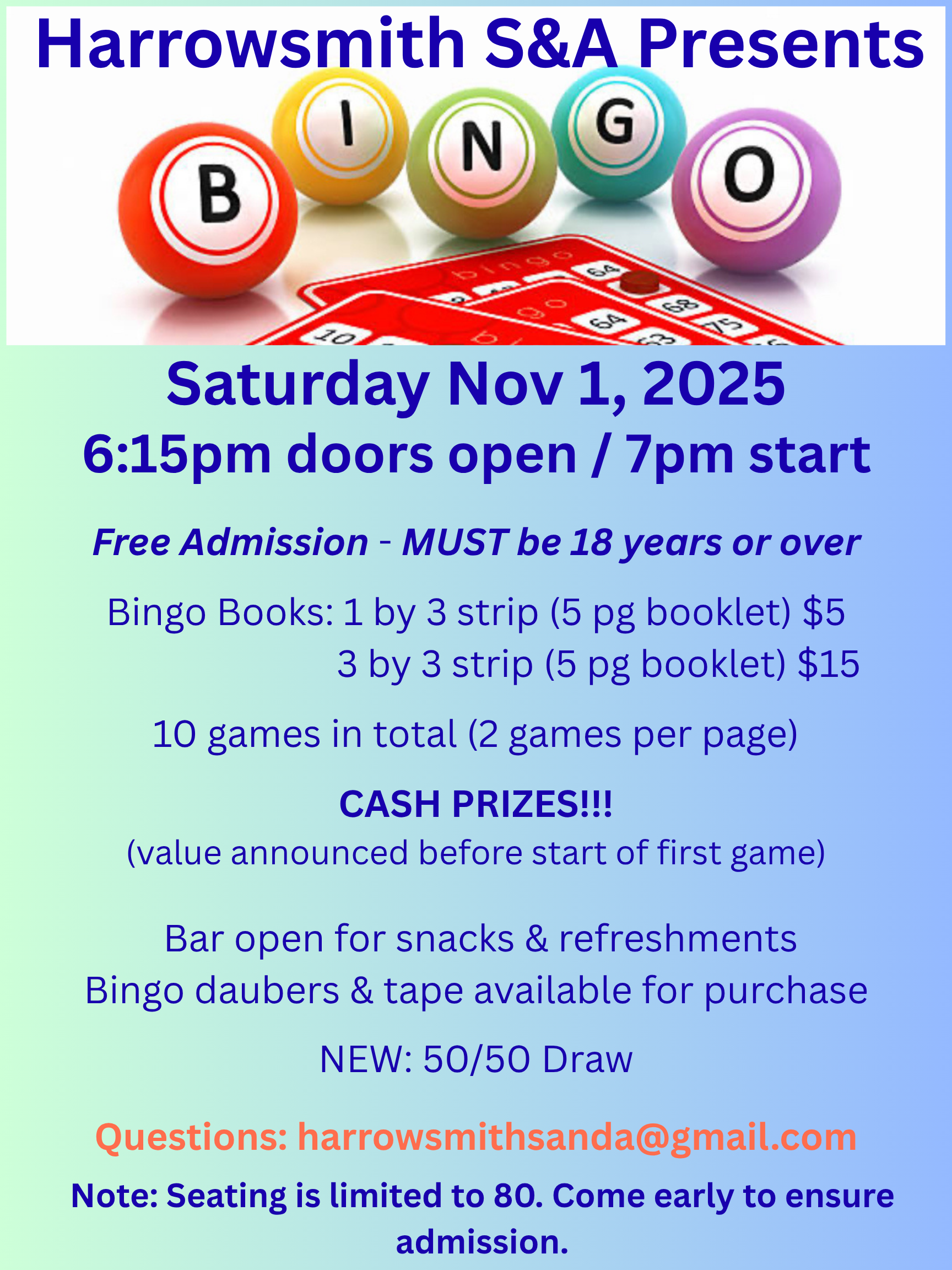 Monthly bingo to take place at the Harrowsmith S&A Club on November 1, 2025. Doors open at 6:15 pm with games starting at 7:00 pm. MUST be 18+ to play. All bingo card sales are cash only - note: cash back is available via debit machine at the bar.