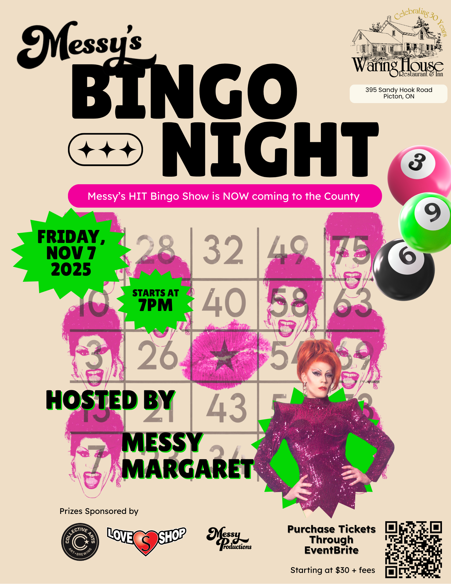 🏨 Special Stayover Deal: Why go home when you can keep the party going? Book your Drag Bingo tickets, then call The Waring House at 613-476-7492 ext.1 to get 20% off your room. Just flash your bingo ticket at check-in.
